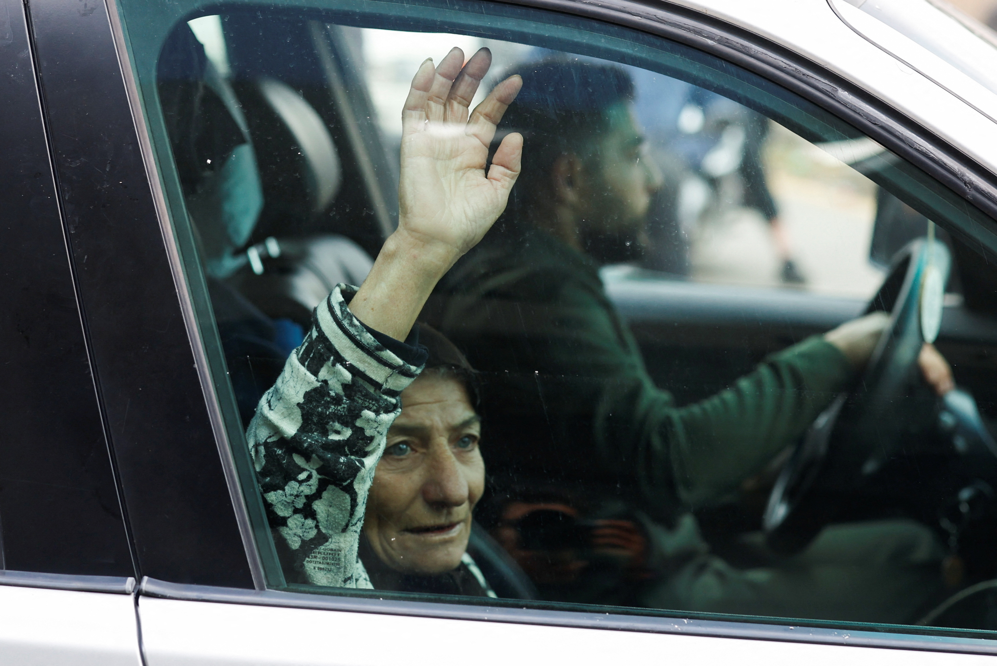 11月27日,在黎巴嫩提尔,别称女子搭车复返家园时挥手庆祝息兵左券奏凯。新华社 发